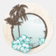 Hermoso diseño con flores de hibisco estilizadas y siluetas de palmeras complementadas con un bonito color azul en un círculo. Se ha añadido un poco de angustia al color para darle un poco de "omph". Escriba su nombre o un mensaje pequeño en el círculo o déjelo como está.