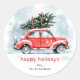 Pegatina Redonda Classic Watercolor Red Car Christmas Tree Holiday