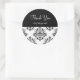 Aquí hay una etiqueta elegante de agradecimiento pegatina con un patrón de damasco esporádico en blanco y negro elegante junto con hermosas plantillas de texto que puede personalizar en línea. Diseñado para los negocios gracias a ti gracias a los clientes, boda gracias a los invitados, o gracias personal.