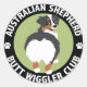 Pastor Australiano Tricolor dentro de un círculo negro con fondo verde claro moviendo su trasero con las palabras "Club de Contrabando de Pastores Australianos".