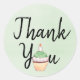 Utilícelo de estas acuarelas verdes Gracias pegatinas de pasteles como sellos para sobres o favores de fiesta. 'Gracias' está escrito en una tipografía con un lindo guión con un quequito helado verde sobre un fondo de color verde. Un gran pegatina para personalizar según lo necesites o mantengas tal cual.