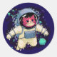Un gato vestido con un espacio flota a través de una colorida galaxia llena de pequeños planetas y estrellas. Su curiosa expresión sugiere un viaje caprichoso a través del espacio.