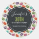 Cumpleaños gracias pegatinas con un lindo patrón de macarones en muchos colores diferentes con un tenue patrón de puntos polka detrás. Un círculo negro sobre la parte superior con tu texto personalizado dentro.