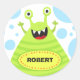 Pegatinas de nombres personalizadas, amables y divertidas, con un monstruo alegre, verde, rayado o un personalizado alienígena con texto de personalizable sobre un óvalo amarillo, caprichoso, con un borde de puntito naranja en su vientre. Agrega tu nombre u otro texto. El monstruo es feliz y parece que está aclamando. Diseño luminoso y colorido para los niños, genial como etiquetas de propiedades o placas de libros para niños y chicas. Hay otros productos de coordinación disponibles.