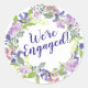 Las flores moradas de bonito y las hojas verdes crean una floral festividad. Estamos involucrados está escrito en un guión morado. Perfecto para una celebración de primavera o verano. Utilice este pegatina de compromiso púrpura para sellar sobres o favores de fiesta.
