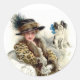 Deliciosa escena vintage con una dama de moda con un elegante gorra y abrigo de piel. Ella está sentada con su pequeño perro.
