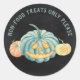 Acompáñese con su truco o tratante con este pegatina para que los que dan tratamiento sepan que los tratamientos no alimentarios son apreciados por las alergias. El diseño incluye un sonriente gato verde azulado de calabaza de linternas flanqueado por pequeñas calabazas, con "golosinas no alimenticias solamente por favor" en letras verde azuladas.
