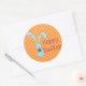 Un lindo pegatina de conejito azul de Pascua, el conejito tiene orejas grandes y disquetes y tiene orejas rosas, nariz casera y pies rosados. Está sosteniendo un montón de tres huevos de Pascua, y en el fondo hay un brillante y alegre fondo de puntos de polka naranja. El saludo que dice 'Feliz Pascua' puede ser personalizado si lo deseas.
