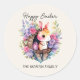 Pegatinas de Pascua con conejo conejo y flores moradas y rosas. El texto dice "Feliz Pascua". Personaliza con tu nombre. Perfecto para envolturas o sellos para sobres de regalo.
