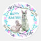 Dos conejitos están en el centro de una corona floral azul brillante, rosa y violeta en esta divertida pegatina de Pascua. Junto a las imágenes de conejos hay texto en azul aqua que dice ¡Feliz Pascua! Perfecto para sellar correspondencia o bolsas de regalos de Pascua.