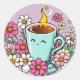 Pegatina Redonda Copa de Coffee y Flores Cálidas