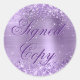Crea tus propios pegatinas pegatinas de "copia firmada" con un purpurina morado de luz romántica y Relieve metalizado metálico falso. El diseño se imprime como una foto, o un falso purpurina. Se puede personalizar el color del texto y del fondo. Tipo clásico de letra de guión de caligrafía sofisticada.
