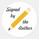 Una etiqueta pegatina para indicar un libro, revista, artículo, foto, etc., tiene el autógrafo/firma del autor/ilustrador/ artista/ fotógrafo.
