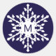 Pegatina Redonda Copo de nieve blanco monogramado sobre azul marino