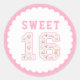 Este dulce pegatina de 16 presenta el número 16 en un patrón de rosa de cabaña rosado con dulce en un tipo de letra de variación rosa. Hay un borde de vieiras alrededor del borde.