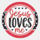 Precioso pegatina de círculo religioso con un precioso fondo de chevron rojo y corazones. Dice "Jesús me ama" en fuentes divertidas y festivas. Ideal para Día de San Valentín o escuelas dominicales.