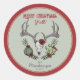 Este país occidental "Feliz Navidad y Todos" Navidades alrededor de un pegatina presenta ilustraciones occidentales dibujados a mano de un cráneo de reno adornado con rosas rojas y cactus festivos con tinta negra. Nombre familiar personalizado. Elegante fondo verde sabio y frontera roja festiva.