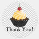 © 2013 Socialite Designs. Nuestra pastelería de cupcakes de costura gracias a las juntas de sellado / los pegatinas tienen un elegante quequito de cerezo con puntos de polka en blanco y negro. El fondo tiene un fondo de chevron en gris.