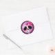 Este bonito cráneo de azúcar morado está decorado con remolinos tribales y gotas de un gran corazón en medio de la frente. Una única rosa rosa se sienta en el costado del cráneo redondo justo encima de los grandes ojos negros. Los pedales de flores violetas rodean los ojos y la boca tiene puntos que la hacen subir por el costado de la mejilla. El cráneo se sienta sobre un fondo violeta profundo creando un hermoso contraste. Este diseño pegatina es un ejemplo de este símbolo del Día de los Muertos.