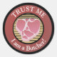 Créeme, soy un carnicero escrito dentro de un círculo con un filete de hueso.