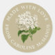 El texto clásico del serif rodea un ilustracion antiguo de una flor de hortensias verdes de color crema y pálido en esta pegatina beige, bonito, estilo milenniqués. Personalice el texto para compartir un nombre de negocio o información personal en sus productos hechos a mano o como una forma elegante de dar regalos hechos con amor a sus amigos y familia.
