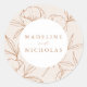 Elegantes etiquetas de boda florales con nombres en color marrón terracota con un fondo de arte floral contra un fondo crema moteado. Etiquetas de boda personalizadas perfectas para usar para sellos para sobres y sellar bolsos de favoritas de boda. Diseñado para coordinar con nuestra moderna colección de bodas botánicos florales.