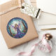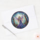 This round fantasy inspired sticker features a stained glass illustration of a moonlit fairy in a flowing purple gown with iridescent wings, holding a staff amid enchanted forest and crescent moon.