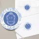 Delft blue floral round sticker, designed in a refined blend of chinoiserie and French toile de Jouy style. The soft botanical illustrations frame an arched layout featuring an elegant wedding crest monogram, perfect for couples who love vintage, historic, and European-inspired aesthetics. Classic typography pairs beautifully with the ceramic-blue palette, making this design an effortless nod to the tradition of “something blue.” Fully customizable with your initials and wedding date, it’s an exquisite choice for any romantic or sophisticated wedding theme.