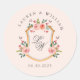 Elegante cresta de acuarela con flores suaves en un fondo rosa pálido con adhesivo redondo de iniciales de pareja para boda romántica.