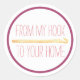 Dulce y simple pegatina para añadir a la envoltura de regalo o al embalaje de sus creaciones de crochet. Incluye un anillo morado y un texto que dice "De mi gancho a tu casa" con un gancho de crochet de color beige en el centro.