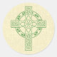 Pegatinas con cruz alta decorada al estilo celta con nimbo / anillo de tréboles que representan la esfera celeste, sobre fondo de arpillera falsa.