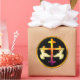 Cruz de hierro multicolor con palomas doradas y plateadas sobre fondo negro