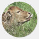 Una hermosa y linda ternera tendida en el pasto largo con la lengua fuera.