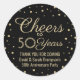 Agregue un toque personalizado a las notas de agradecimiento por aniversario de bodas o a los favores de la fiesta con estas etiquetas redondas negras y doradas / sellos de sobre. Todo el texto es fácil de personalizar o eliminar. Esta plantilla está configurada para un aniversario número 50, pero se puede cambiar fácilmente a otro año o evento, como un cumpleaños. El diseño presenta puntos de confeti dorados de lámina falsa sobre un fondo negro, caligrafía de estilo " Cheers to 50 years" y tipografía minimalista moderna con mensaje personalizable en la parte inferior. Tenga en cuenta que el dorado es un color impreso, no lámina metálica.