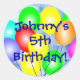 ¡Un popular pegatina de forma redonda para el chico o chica de cumpleaños! Un brillante y divertido ramo de globo colorido listo para su personalización con cualquier nombre y edad de cumpleaños. Se muestra "¡El quinto cumpleaños del nombre!" A este pegatina se le agrega un fondo fotográfico azul detrás de los globos. Una gran ocasión especial pegatina o sello para sobres divertido y colorido para bebés, niños, adolescentes y hombres y mujeres de cualquier edad!