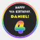Este divertido y alegre diseño de pegatina redondo con temática de cumpleaños presenta el número "4" que tiene un vibrante patrón de gradiente inspirado en el espectro arcoiris, junto con el mensaje "FELIZ CUMPLEAÑOS", y un nombre de destinatario personalizado. Pegatinas como estos podrían ser entregados o usados en una fiesta de cumpleaños realizada para celebrar el cuarto cumpleaños de alguien, o tal vez usados para preparar invitaciones o envolver regalos para un evento de este tipo. [~Z0000637]
