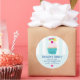 Hecho con pegatinas de negocios de amor para negocios relacionados con la industria alimentaria. Diseñado con un patrón rayado azul claro y blanco combinado con un patrón de puntos polka azul y rosa. Encendido sobre la parte superior hay un lindo quequito azul con helado rosado y una cara sonriente kawaii. Una cereza en la parte superior también tiene una cara adorable y feliz. Una estrella fugaz está volando en el aire