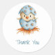 Adorable azul gracias pegatina con un ilustracion de un pájaro que incuba de su huevo. Excelente adición para tu papelería de ducha para bebés. Ilustrado y diseñado por Patricia Álvarez.