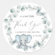 Pegatina amable para tu ducha de bebé gracias a las tarjetas y los favores de fiesta que incluyen "Un pequeño dulce gracias" en una mezcla de tipografía simple y un guión elegante con un toque de corazón y una acuarela de un elefante bebé azul sobre una corona de vegetación de eucalipto verde salado.