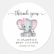 Pegatinas amables para tus favores de ducha de bebé y correspondencia con "Gracias" escrito en un elegante guión de swash y una acuarela rosa pastel de un elefante bebé. Personalice el nombre y la fecha de ducha de la futura madre en una simple tipografía gris.