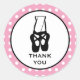 Gracias pegatinas con un ilustracion negro de pantuflas bailarinas de ballet y sus piernas inferiores que son transparentes permitiendo que el color del fondo se muestre. Ballerina está de pie sobre sus pies, en punta. El fondo es un patrón hecho de puntos de polka blancos sobre rosa.
