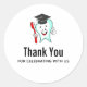 Gracias pegatinas con un ilustracion de un gran diente blanco al estilo personalizado sonriendo alegremente sosteniendo un cepillo de dientes rojo y dando el pulgar hacia arriba. El diente lleva puesto un gorro negro de graduación.