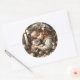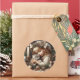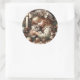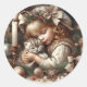 Cuidados pegatinas de Navidad añejos y anticuados. Una niña pequeña sosteniendo un gatito en un Navidad cada noche.