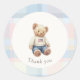 Etiquetas clásicas redondas de favores con un diseño de osito de peluche con acentos de cuadros rosados y azules. Perfecto para una fiesta de cumpleaños Beary First de gemelos atemporal.