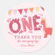 Fiesta de cumpleaños de Dinosaur chica Gracias Pegatina. El diseño presenta la escritura tipográfica ''one'' en la escritura a la moda, dinosaurio y mensaje de agradecimiento ''gracias por pisotear''. Personaliza con un nombre.