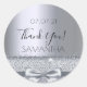 Moderno, elegante y glamuroso para la fiesta de cumpleaños de una chica, mujer, despedida de soltera o baby shower. Un fondo con aspecto de plata falsa con un lazo de plata falsa elegante, cinta y brillo. El texto: ¡Gracias! está escrito con un estilo de letra manuscrita negra moderna. Plantilla para un nombre.