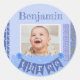 Haz que el tercer cumpleaños sea aún más especial con esta divertida pegatina con un diseño de scrapbooking azul adorable que se puede personalizar con el nombre del pequeño y una foto. Combina con la cinta, etiqueta y bolsas de regalo a juego.