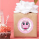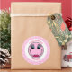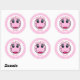 Estos pegatinas presentan una cara de mujer rosa con ojos azules, pestañas largas y labios rosas. Texto rosa brillante "Feliz cumpleaños" arriba y el nombre "Michelle" debajo para que lo personalizes. El fondo son los puntos de polka blancos sobre rosa claro.