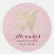 Mariposa de oro rosa, moderna, brillante, elegante, en combinación con fondo rosa purpurina con brillante, patrón de puntos polka. Un pegatina de moda, único y adorable, de cumpleaños femenino, clásico y redondo.