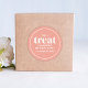 Un diseño con un caprichoso guión moderno de cumpleaños de melocotón, una plantilla minimalista para llevar, un creativo pegatina con un toque de fiesta, una deliciosa galleta de bar buffet de caramelo, un sencillo guión de círculo minimalista, una moda caprichosa de un personalizado personalizar, elegantes etiquetas creativas, un regalo de cumpleaños a favor de la marca rosa, un material de fiesta lindo, para la moda femenina de niñas y chica de cumpleaños